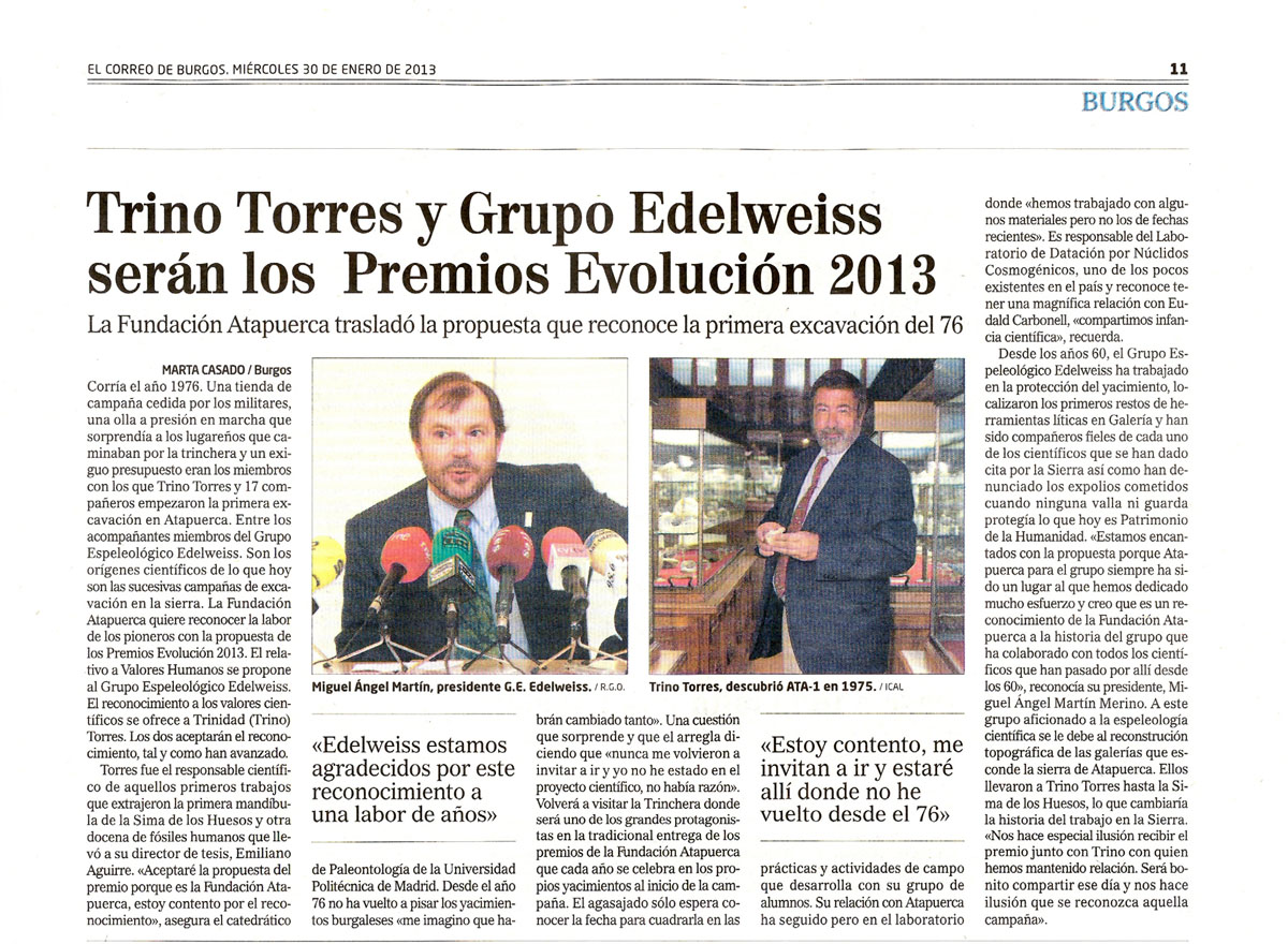 La Fundación Atapuerca ha concedido el Premio Evolución 2013 a los Valores Humanos al Grupo Espeleológico Edelweiss, que se entregará el próximo día 12 del mes de julio. En ese mismo acto también se entregará otro galardón a D. Trinidad José de Torres Perezhidalgo (Trino), con quien nosotros hemos compartido numerosas experiencias que se remontan precisamente a la excavación de Atapuerca de 1976.
